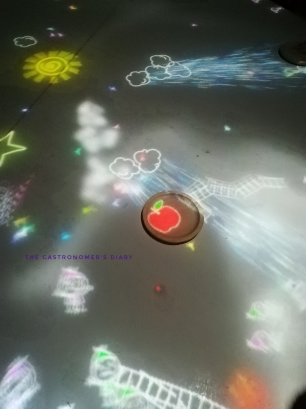 we have read the description of this exhibit on the wall but the best way to actually know what it does is to interact with it. In the photo, an apple appeared on the wooden plate as it blocked the rain. When you touch it with your hand, it separates into many mini apples. Sometimes a cake appears instead of an apple. When you put objects on the table, the little people can climb on it as it it is part of their village.