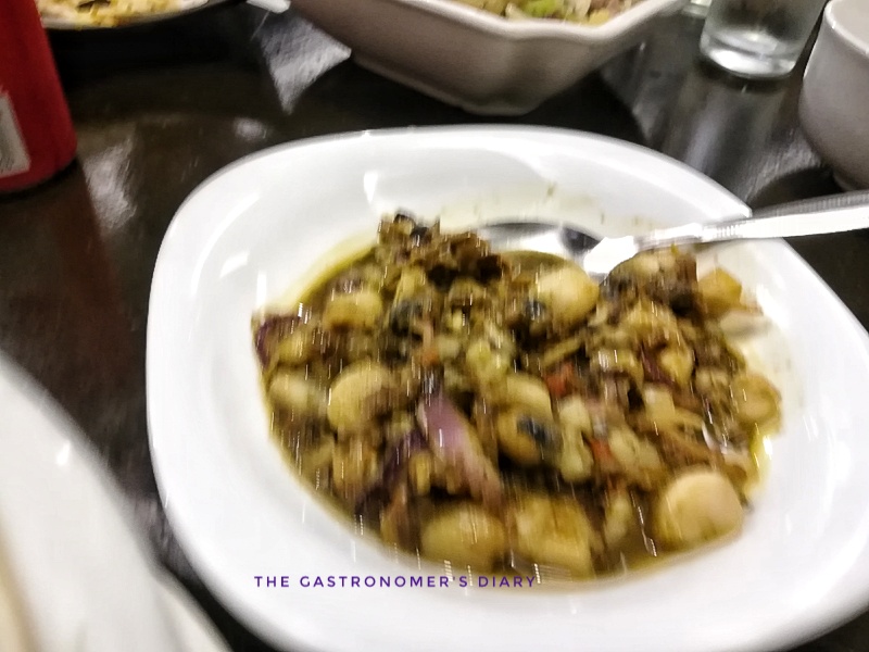 Adobong Sarad – a type of shellfish, similar to scallop meat in texture, cooked in a soy sauce base. Sadly, this blurred excuse for a photo is the only one I have for this dish…