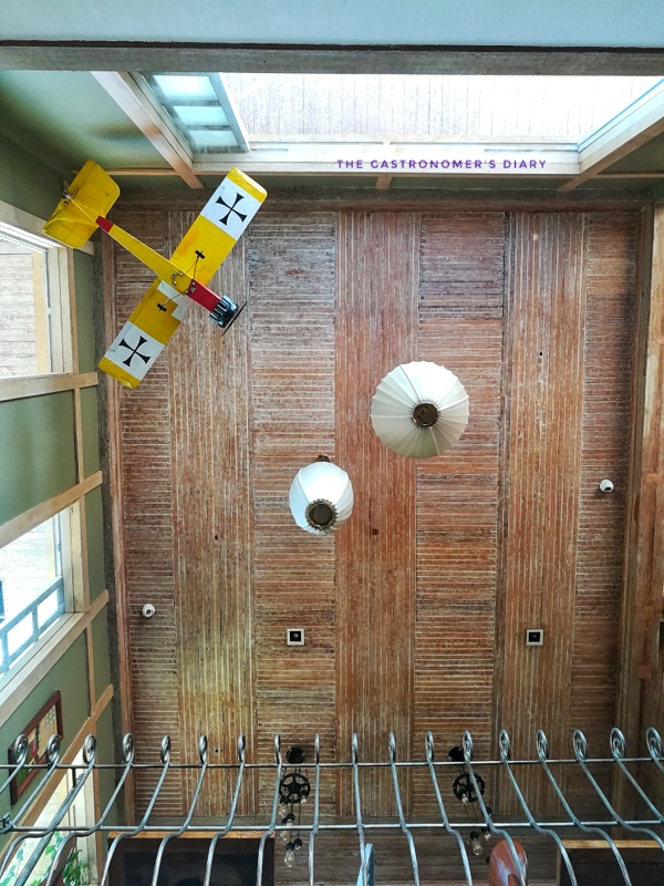 Taking a break, looked up and saw a hand made airplane decor casually hanging with the ceiling lamps.