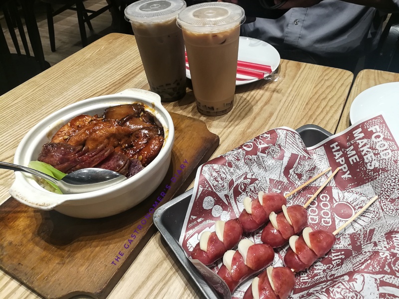 Shitake mushrooms, Taiwanese style sausage, and chicken atop soft rice. Good enough for two I think. I just like the earthy taste of the mushrooms. The sausages here had sauce glazed over it so it tasted kind of different form the one on sticks. Sharing the sauce was chicken pieces for a complete meal.