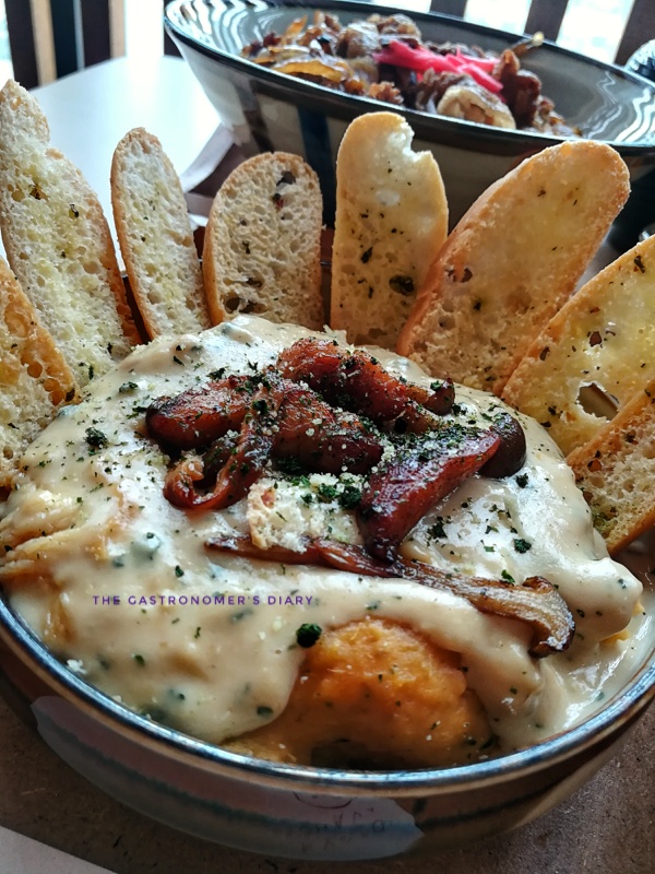 One of my favorites. The dip was made of mashed sweet potato base, topped with a cream sauce, pieces of miso chicken, and some mushrooms. If you’re into the sweeter version of mashed potatoes, this one is for you. The saltiness from the cheesy cream balances out the flavors along with earthiness from shiitake mushroom pieces.