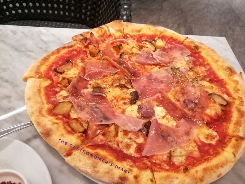 Mozzarella, shitake, tomato, potato, parma ham, red onion – Chose this because of the parma ham + shitake mushroom combo. The shitake pieces werequite small, possibly to not overpower the flavor of the ham.