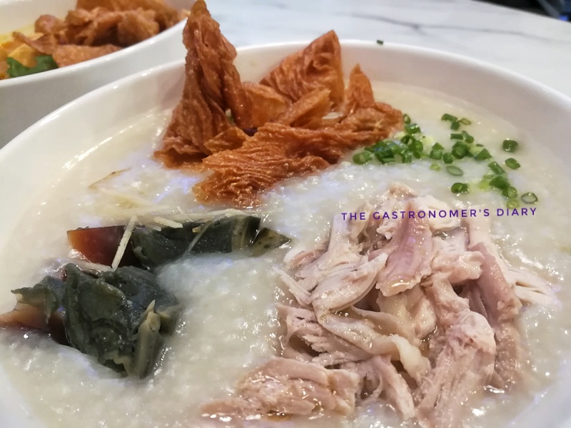 Rice porridge topped with chicken slices, century egg, and fried beancurd(?). Big serving too.